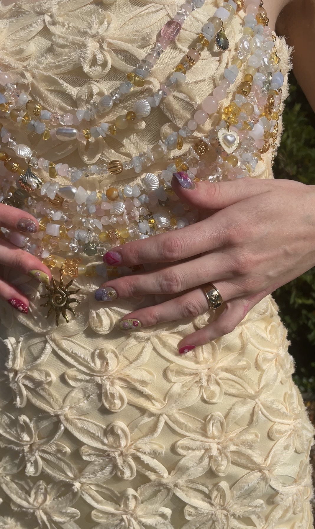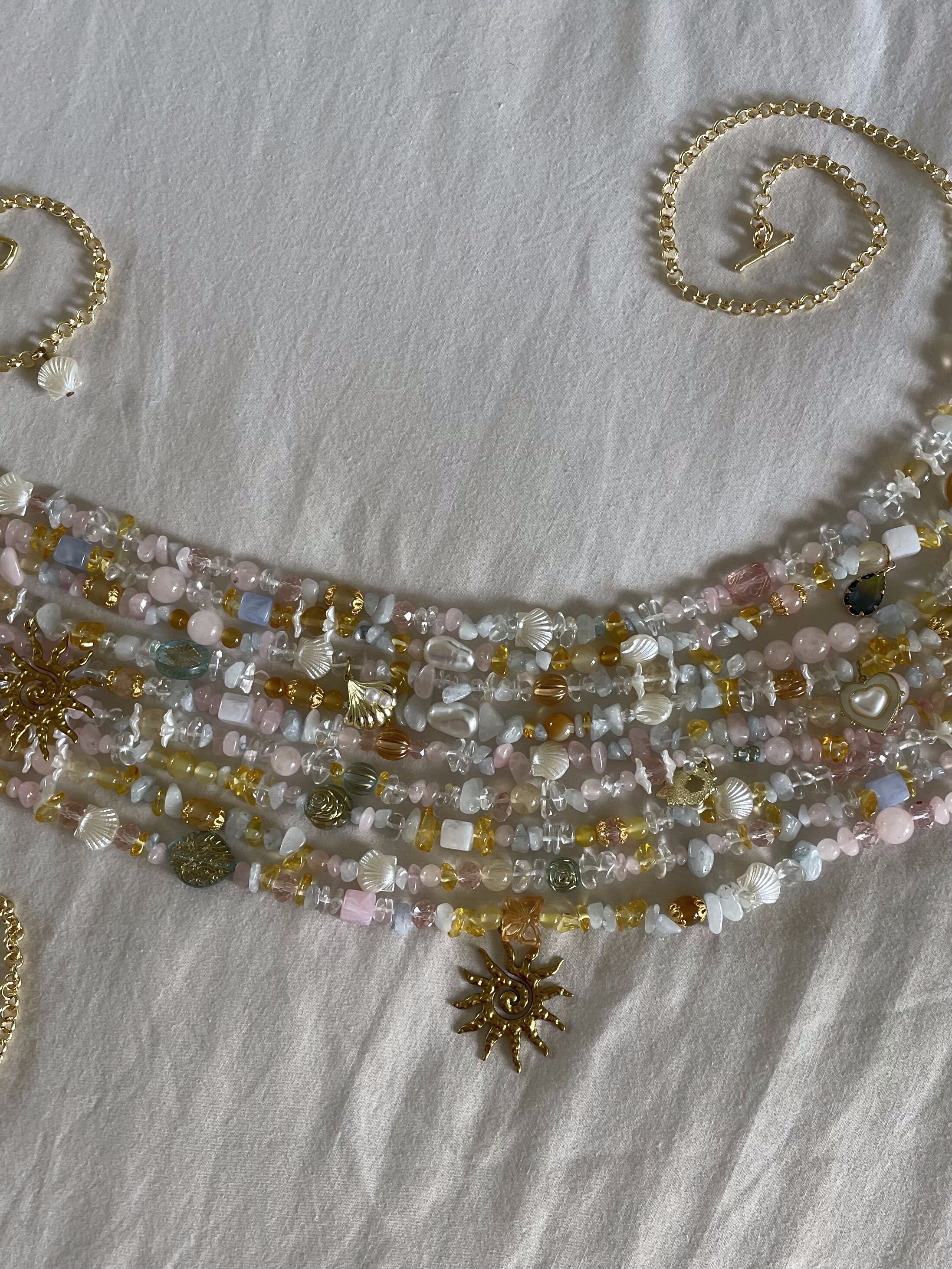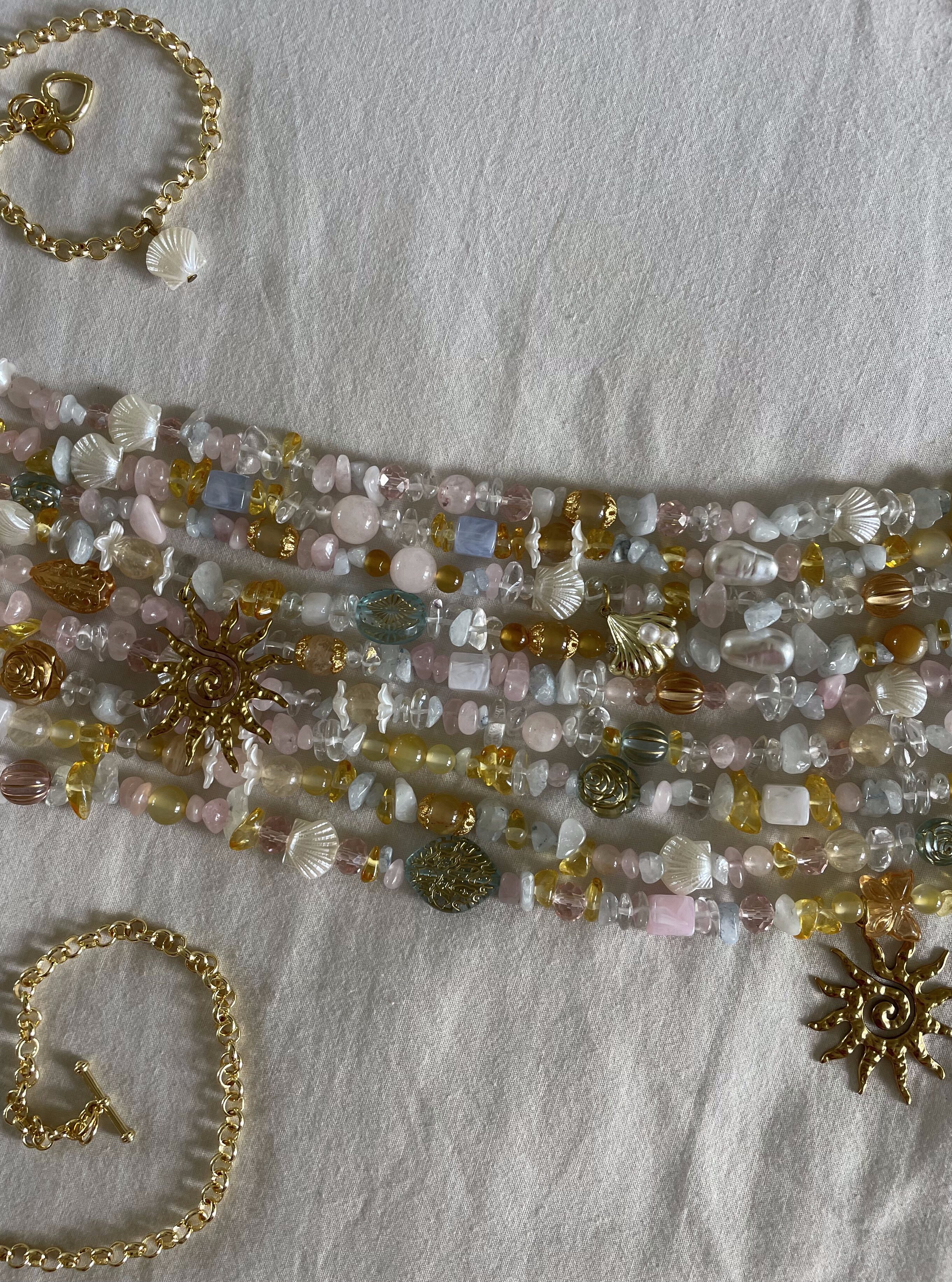 rose quartz, glass beads, acrylic beads, plastic beads, gold-tone mixed metal findings, gold plated chain